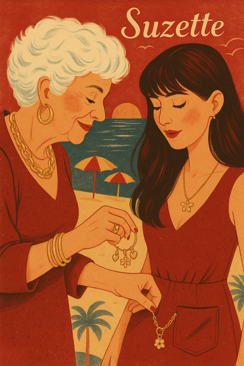 Suzette, qu’on appelle affectueusement La Suze, est une femme élégante et malicieuse. Toujours un bijou au poignet, une astuce au coin des lèvres, et ce petit grain de folie rétro qui illumine les journées.