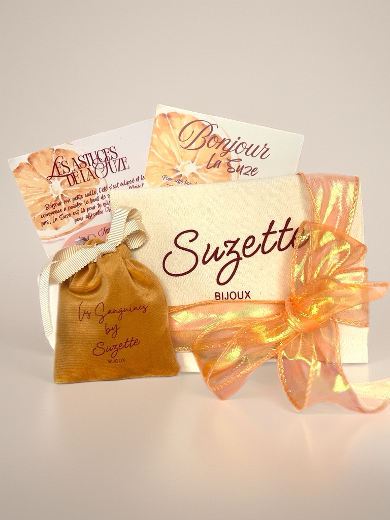 Chaque mois : 1 bijou surprise + 1 pochon + 2 cartes pleines de secrets (astuces et jeu à gratter). Une box réutilisable, complice et pétillante… signée La Suze