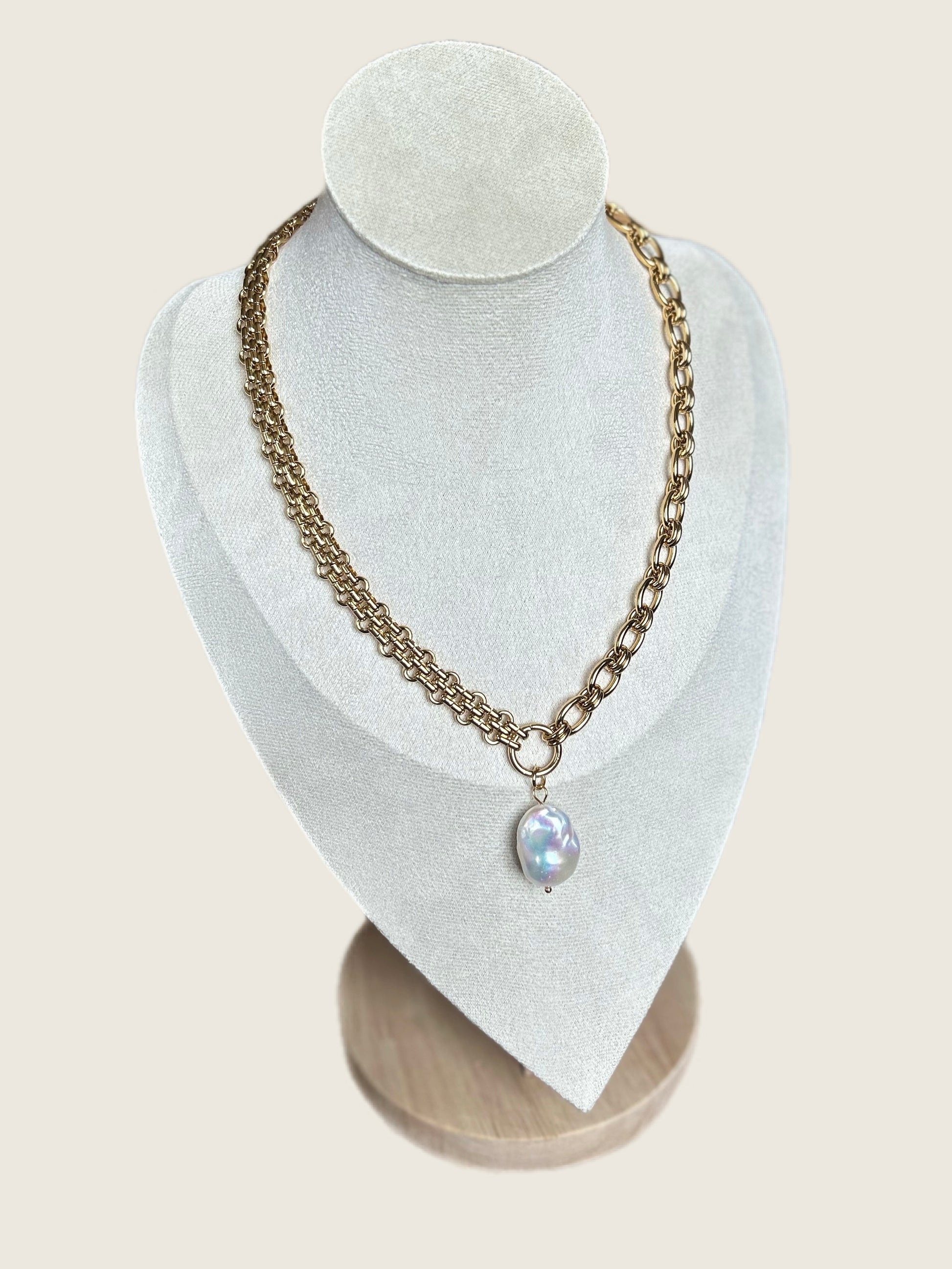 Adélaïde a cette allure qu’on remarque au premier coup d’œil. Elle aime les pièces fortes, les symboles clairs : deux chaînes imposantes, un cercle comme promesse, et une perle de nacre qui brille au centre. Elle avance droite, sûre d’elle, portée par une noblesse naturelle.
