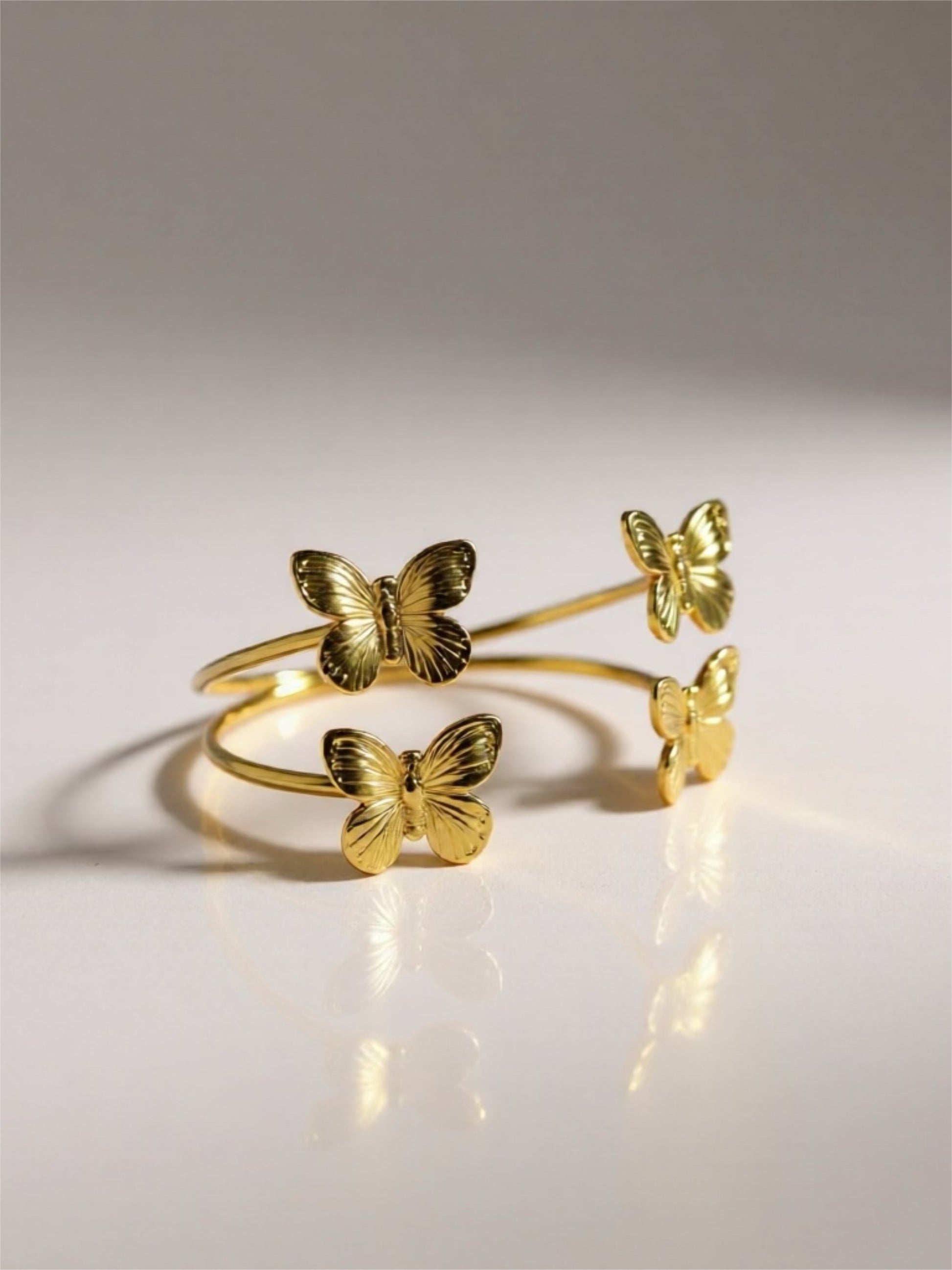 Apolline, c’est la noblesse de cœur et la grandeur d’âme. Avec ses deux joncs reliés, elle unit force et élégance, comme deux lignes de vie qui avancent côte à côte. À chaque extrémité, deux papillons se répondent en miroir, comme des âmes sœurs prêtes à s’envoler ensemble. Un bijou ouvert, qui respire la liberté mais garde sa solidité.