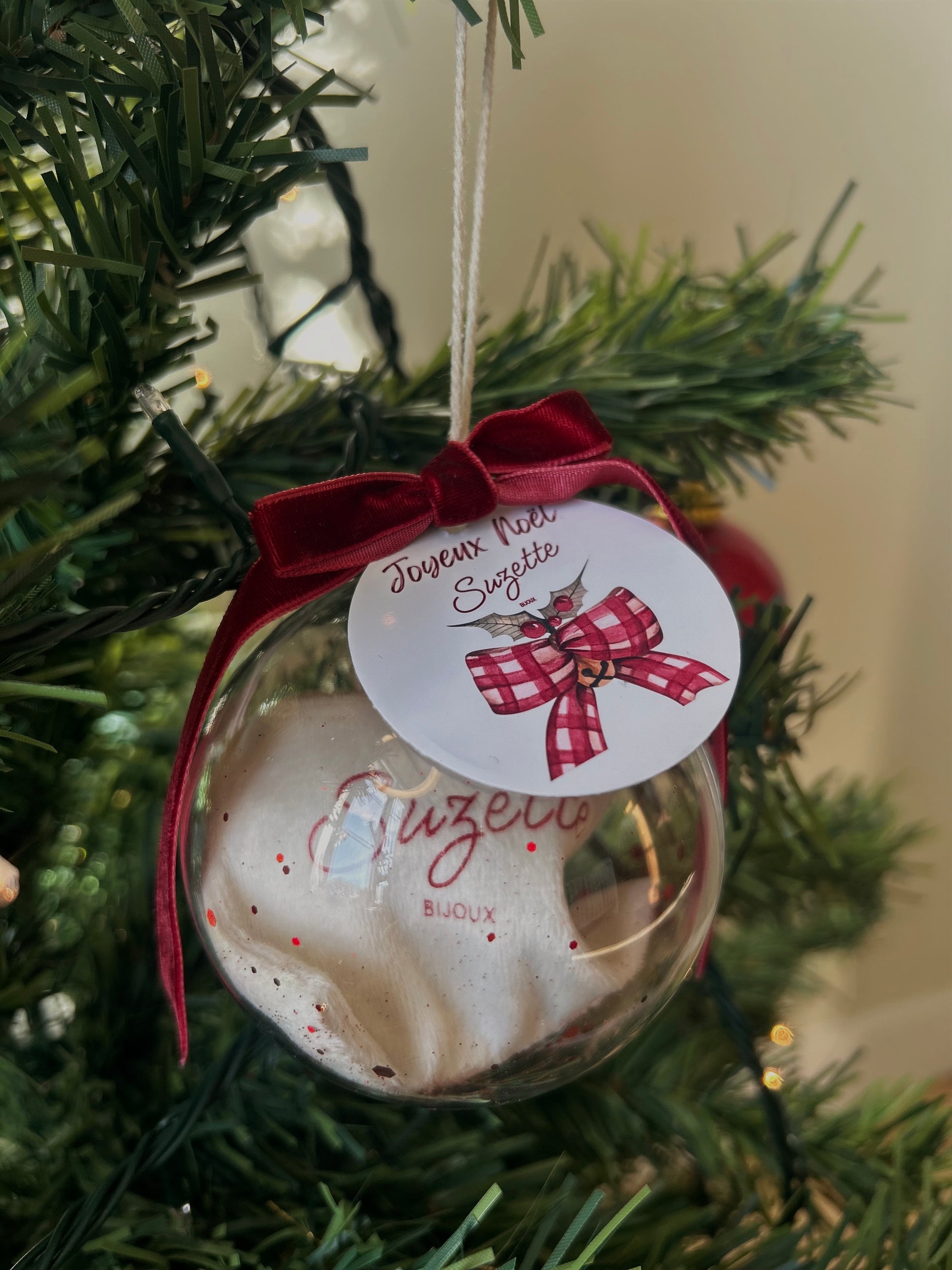 Personnalisé avec votre ruban préféré, fabriqué à la main, puis présenté dans sa boule de Noël prête à accrocher au sapin.